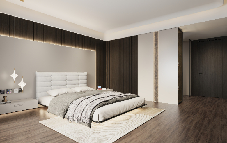 床头背景墙采用深浅的撞色设计,奶白色护墙板搭配棕色格栅板,分段式设计前后对比,打破沉闷,极具视觉层次感。意式极简床品,全案软装配套,让 Amy从财务数字世界里解脱,步入美梦空间。