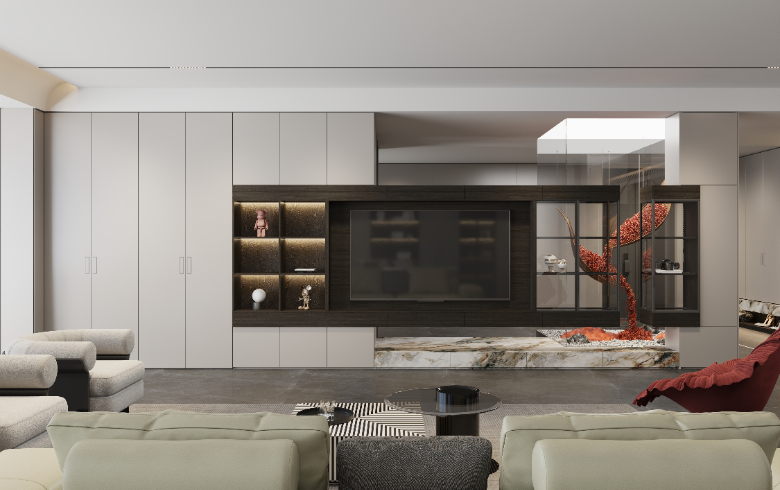奶白色背板搭配深色开放格,轻松打造高级感电视背景墙;底部悬空放置植物与摆件,让业主在闲暇之余,感受到空间带来的呼吸感。