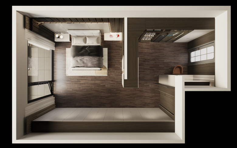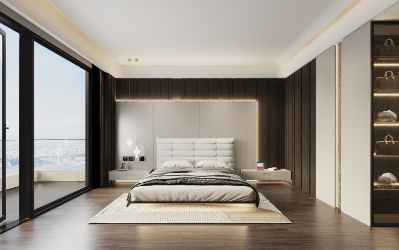 一字型通顶衣柜,搭配侧边开放格,放置帽子、包包等随身饰物,悬浮床头柜,节省空间,高级有格调。精细化设计,满足四季衣物收纳需求。