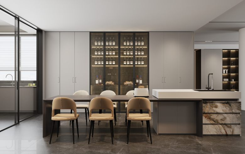 岛台餐桌形成一个整体,让餐厅的功能性大增。这里不限于用餐,还能作为日常休闲的茶吧或西厨料理烘焙台,甚至可作为临时办公场所,相较于单独的餐桌,该设计让空间利用率更高。