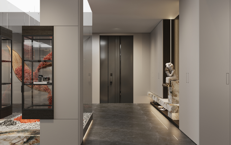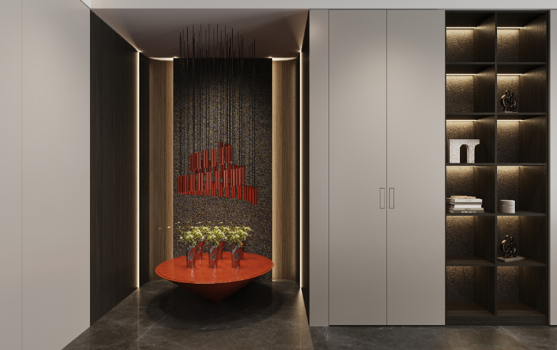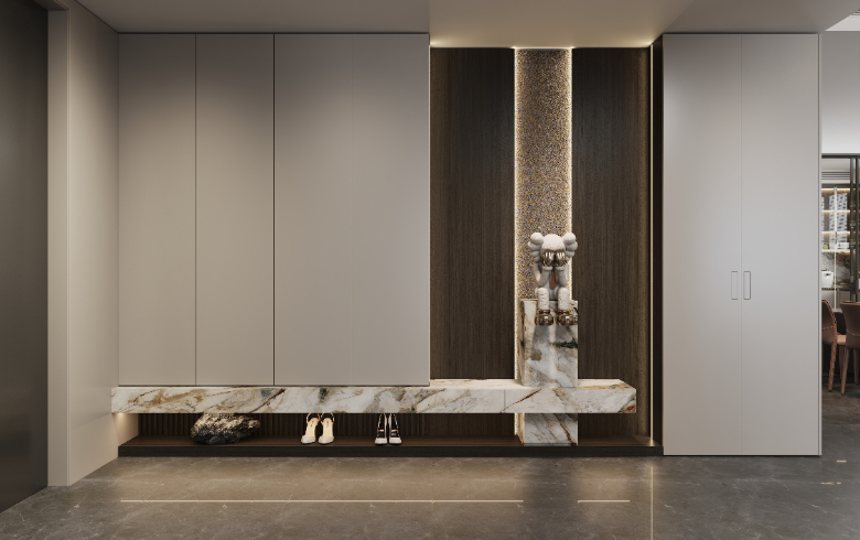 通顶玄关柜横向延伸,收纳翻倍。底部悬空方便换鞋,提升入门整洁度,地台加持,高级加倍;中部镂空开放,摆设饰品,放置出门必备物,生活的并井有条从归家开始。