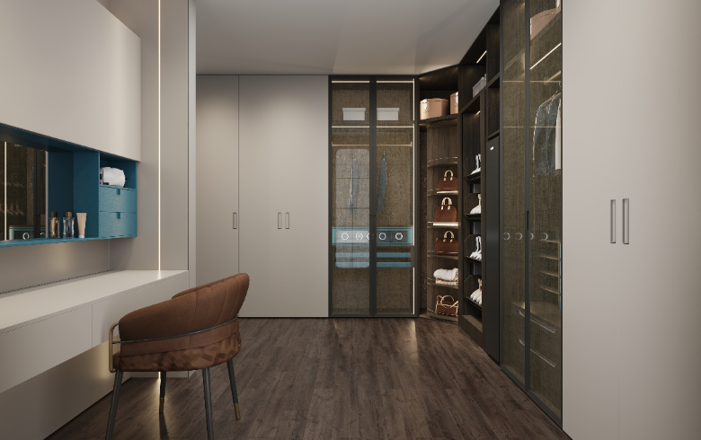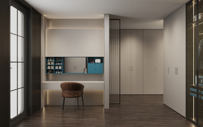 衣帽间设置梳妆台,模块化功能分区,秩序井然,兼具实用性与视觉美,新颖别致的开放格设计,满足Amy放置常用的护肤化妆品。