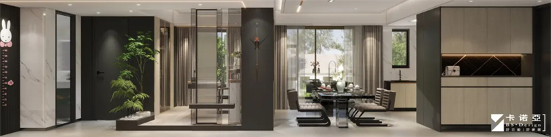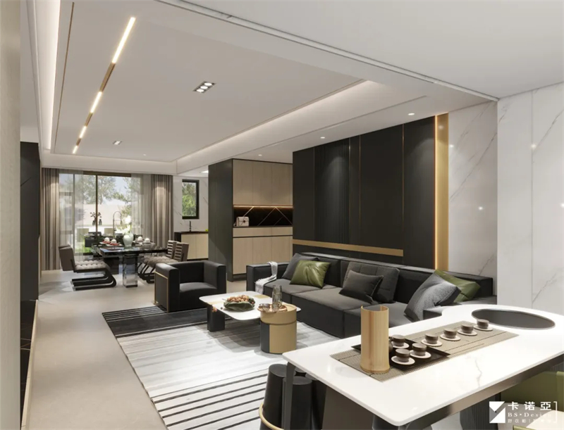 去客厅化设计,客厅与阳台之间茶台隔断,构筑一个最美的品茶区 ,客厅可同时满足会客、办公就餐,以及兼顾茶室功能,不再将客厅功能固化,而是让业主按照自己的使用习惯和生活方式进行随意使用。