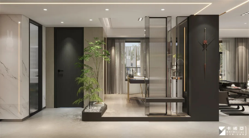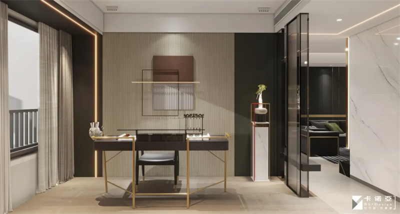 开放式书法室,以淡雅、宁静色调为主,深色点缀,营造静谧、专注的氛围。材质上,选用格栅板、金属、玻璃、大理石等跨界混搭,绿植点缀,既符合书法的自然气息,又能提升室内的轻奢质感。