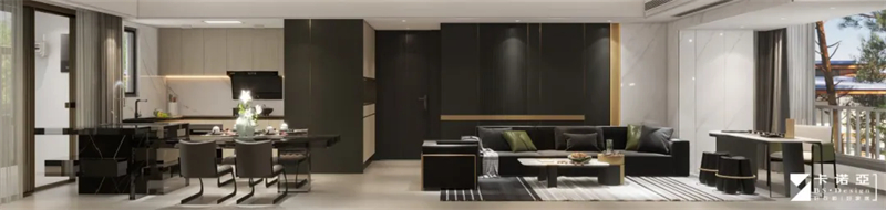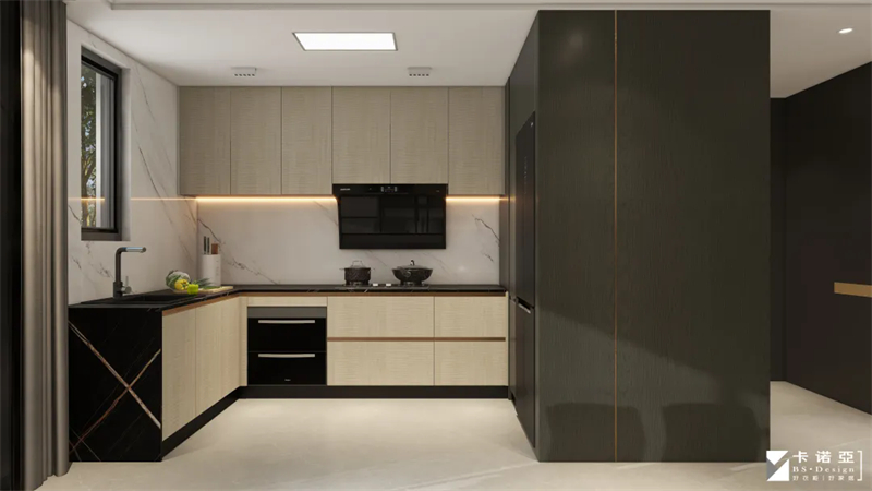 ③厨房采用高级黑+白撞色设计,温馨木色减缓空间冷感