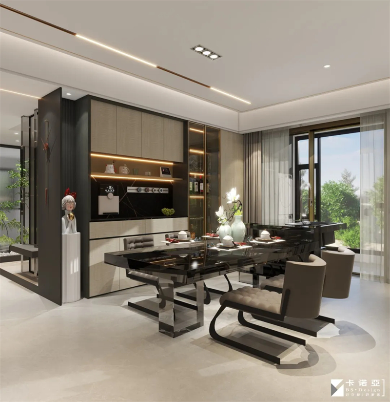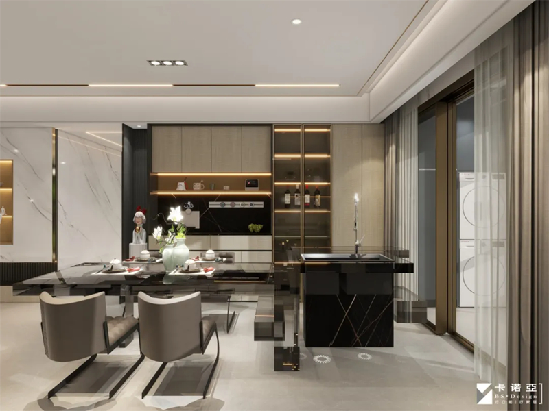 靠近餐桌的地方设置了餐酒柜,色彩与全屋呼应,茶色玻璃柜门通透可见,可以收藏香槟与红酒、杯具,觥筹交错,微醺生活,是E人聚会轰趴的好地方。