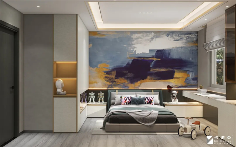 悬浮顶+灯带吊顶设计,除了辅助照明外,还能让空间凸显温馨氛围和层次美。床头柜与衣柜及书桌一体化设计,不占地儿更整体。