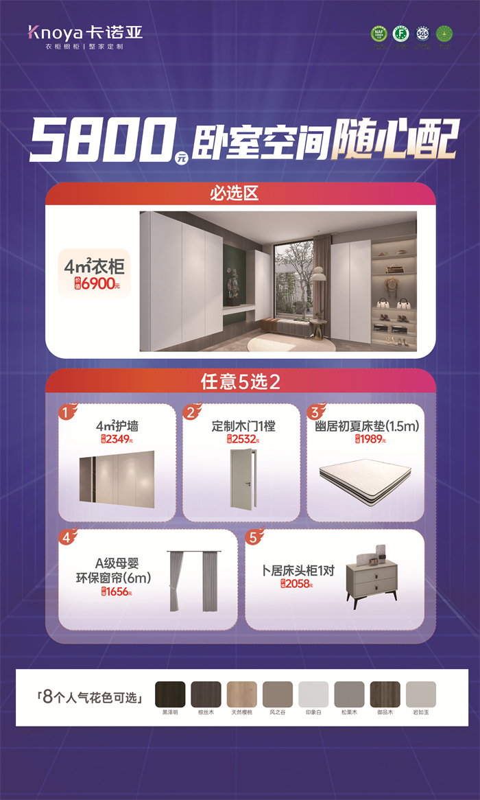 卧室空间随心配5800元套餐,必选4㎡定制衣柜,8个时尚花色可选,分别是黑泽明、棕丝木、天然樱桃、风之谷、印象白、松栗木、御品木、岩如玉。套餐中可以自由选择的产品包括4m护墙、1樘定制木门、1.5m护脊床垫、6米A级母婴环保窗帘、1对床头柜(5选2),一个套餐仅需5千多元,就能将柜、墙、门等产品一站配齐,真正实现“一家搞定,一价配齐,一体设计”。