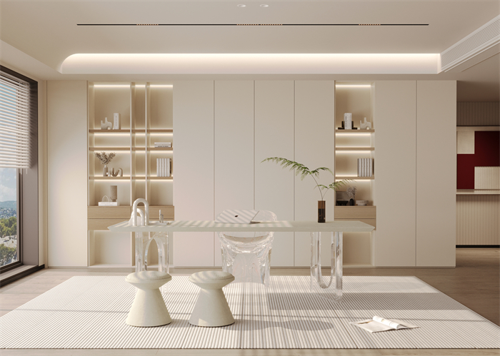 4、书房:整个房间用调和后的暖白色打底,整墙书柜既有开放格及玻璃门,更有封闭柜,展示、收藏兼备。透明材质的桌脚与座椅,让空间通透敞亮、浅淡平和,是妥妥的“C位担当”。一株绿植,给温润通透的空间带来活力。百叶窗遮光,颜值和实用兼顾。