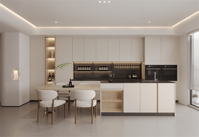 2、餐厅:纯粹简雅的奶油白配色,轻松营造愉悦的就餐氛围。餐酒柜三段式设计,上半段带玻璃门、灯带,适用于展示美酒、饰品,加上凹槽处艺术3D挂画,品味格调凸显,高级感拉满;中间镂空处台面,可用做收纳、水吧台、小电器等;下半段抽屉较多,收纳更强。