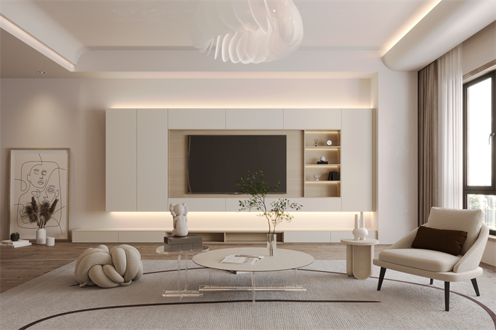 1、客厅:一眼望去,一股朦胧的奶白感拂面而来,顿时让人卸下疲惫,心生平静。回字形电视柜,打造整墙收纳,底部悬空设计加灯带,轻盈时尚、自在舒适,营造暖和的氛围感。