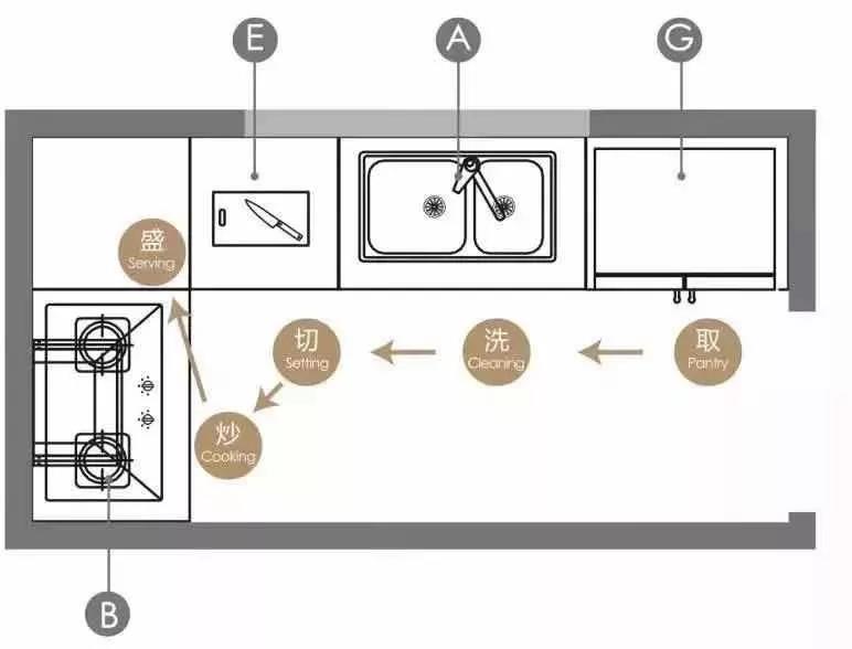 想要下厨不累,厨房动线和布局一定要合理。最常见的橱柜布局有一字型、二字型、L型、U型和中岛型5种,要根据厨房面积大小和管道位置选择,不管选哪种,都要保证洗、切、炒的动线最短。
