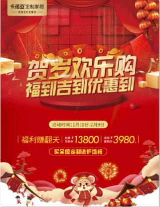 春节期间卡诺亚服务不打烊。1月10日-2月9日,卡诺亚在全国千余家门店为业主朋友们准备了“贺岁欢乐购·福到吉到优惠到”的新年开运大礼,关爱意向客户,维护老客户群体,启动线上线下互动的“新春开门红”活动,倡导“空间定制,省钱省事”,让利实在,不玩套路,吸引了不少刚需消费者咨询乃至下单。