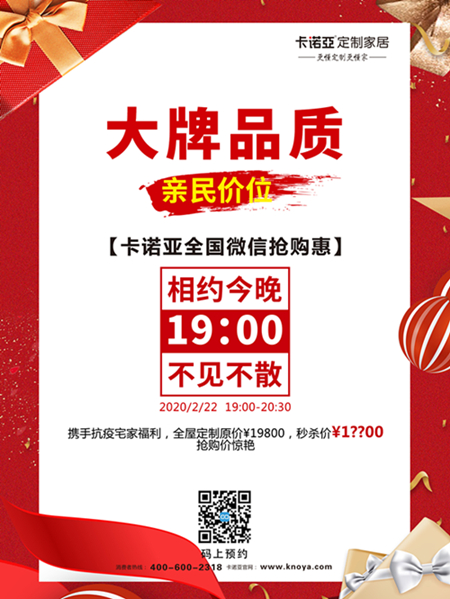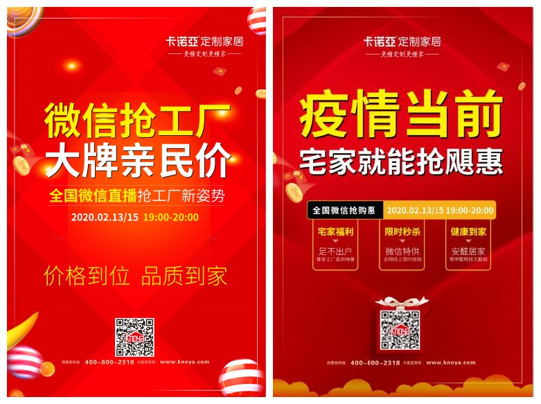 被疫情隔离的潜在装修需求,有了线上的助力,迅速爆发出巨大潜力。眼下部分企业刚刚开始复工,物流也尚未恢复正常,对于有装修需求的用户而言,提前做好装修规划,未尝不是宅家的另一种选择。因此,卡诺亚采取线上微信抢购、限时优惠等多元销售模式,并加强与线上消费者的沟通和互动,2月27日还将开启“卡诺亚定制家居3·15品质直播盛典”。至此,卡诺亚率先掀起的新零售模式,将成为疫情期间家装销售的重要渠道。