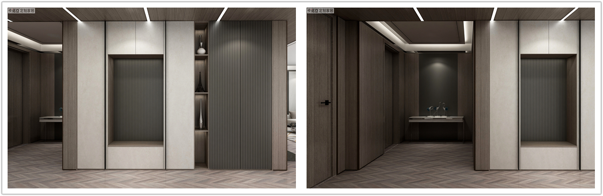 流金溢彩系列,整体设计不繁琐,不重色彩的浓烈而重线条的表达,以局部的细节彰显空间独特的韵味和文化厚度,形成传统与现代元素和谐共生的新中式空间。流金溢彩系列点睛之笔在于门板、护墙板、抽面采用内嵌式回纹型金属条,一改门板平面单一的刻板印象,满满的轻奢高级感扑面而来。