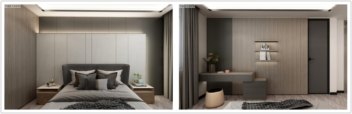 米色成为空间的主色调,辅以木纹材质,自然而舒适,营造良好的睡眠环境。回纹型金属条及黄铜色拉手点缀空间,尽显新中式风格的轻奢观感。
