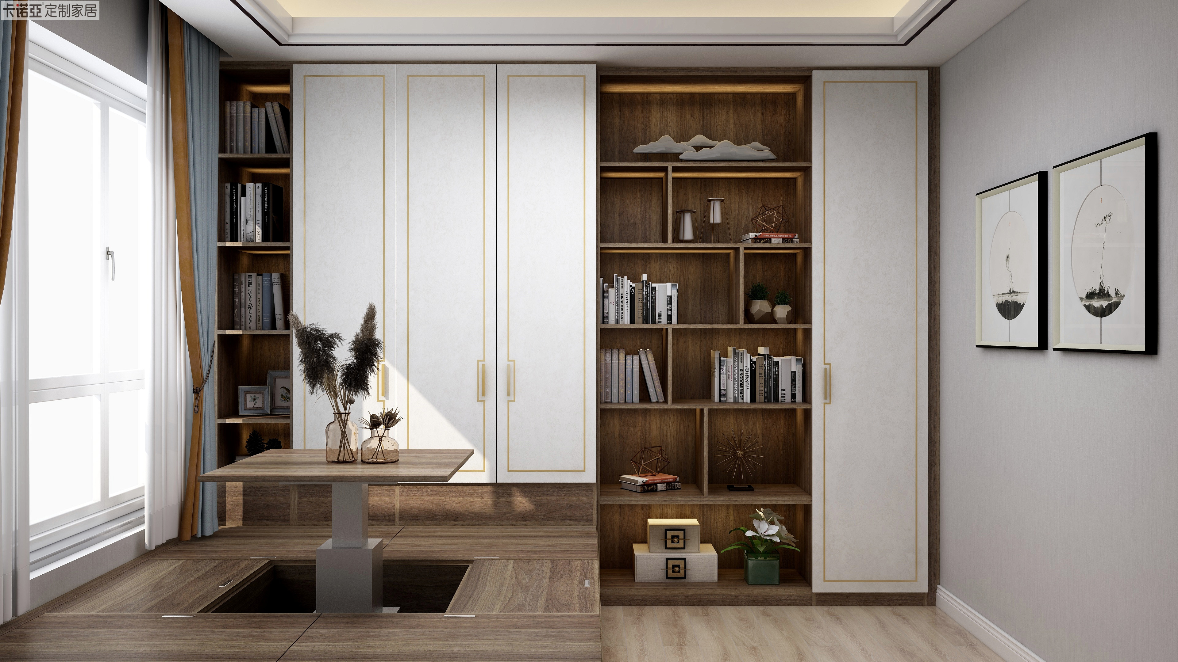 榻榻米是多功能房的不二之选,采用卡诺亚“御品木”的榻榻米,彰显东方式书房的恋木情结。与榻榻米连为一体的书柜,柜门采用浅色花纹,表面同样嵌入回纹型金属条,加上金属拉手的点睛,让中式书房宁静致远中绽放优雅之美。
