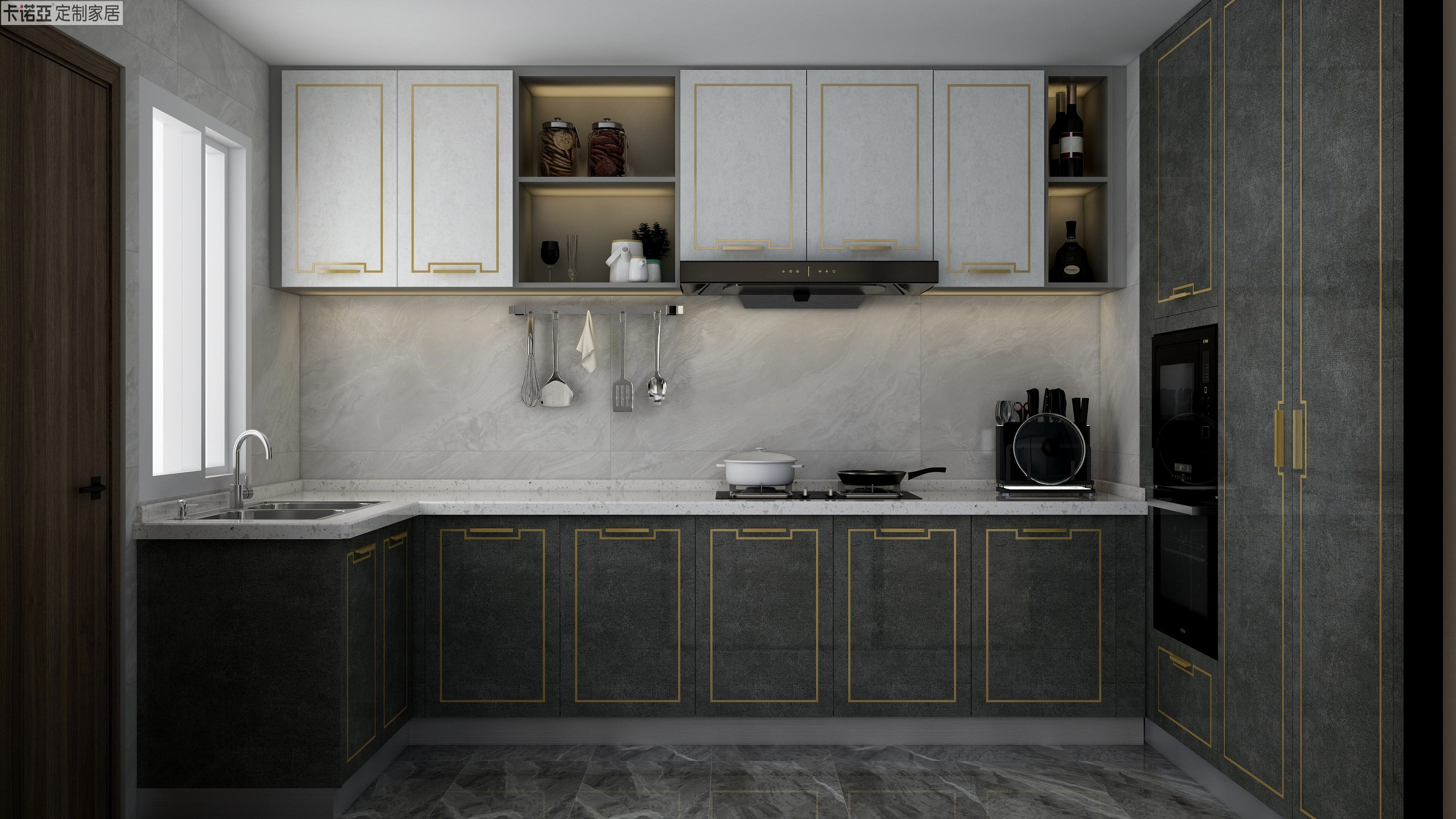 君子远庖厨,当代君子则乐于下厨。吊柜地柜一明一暗的撞色设计,让厨房多了一份视觉层次之美,表面同样嵌入回纹型金属条,高端厨房呼之欲出,在这样的唯美空间一展厨艺,何乐而不为?