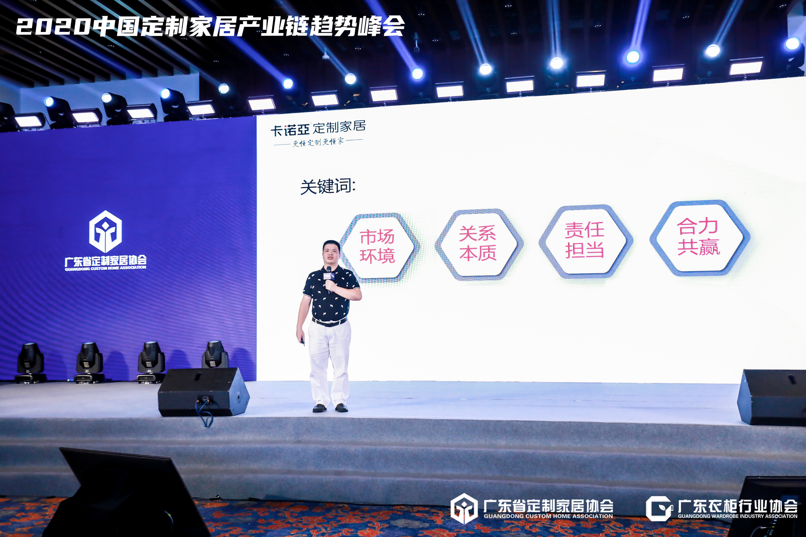 本次峰会上,卡诺亚副总裁兼营销总经理赖永精发表的《同心协力,服务需求》的主题性演讲当中,从市场宏观大环境、关系本质、责任担当、合力共赢4大层面进行剖析,指出在国内大循环为主体、“十四五”规划、扩大内需战略、完善城市化战略大背景趋势下,定制家居上游的供应商与中游的生产商,并非只是简单的买卖关系、供需关系、利益关系,而是荣辱与共的利益共同体、唇齿相依的命运共同体。思维决定行为、定位决定高度,作为供应商,要做到品质先行、高效服务及价格适中,而卡诺亚作为生产商、品牌商,为了给下游的消费者带来好产品、好服务、高价值,同样要做到保质保量、准时交付、环保节约,担负起企业应有的社会责任。最后,赖永精呼吁中国定制家居上下游企业互为一体,应该在协会这个资源大平台的基础上,做到趋势共造、平台共建、内容共享,中游主导需求,专业分工合作,为消费者提供家居整体解决方案,协力服务需求,同心共赢未来。