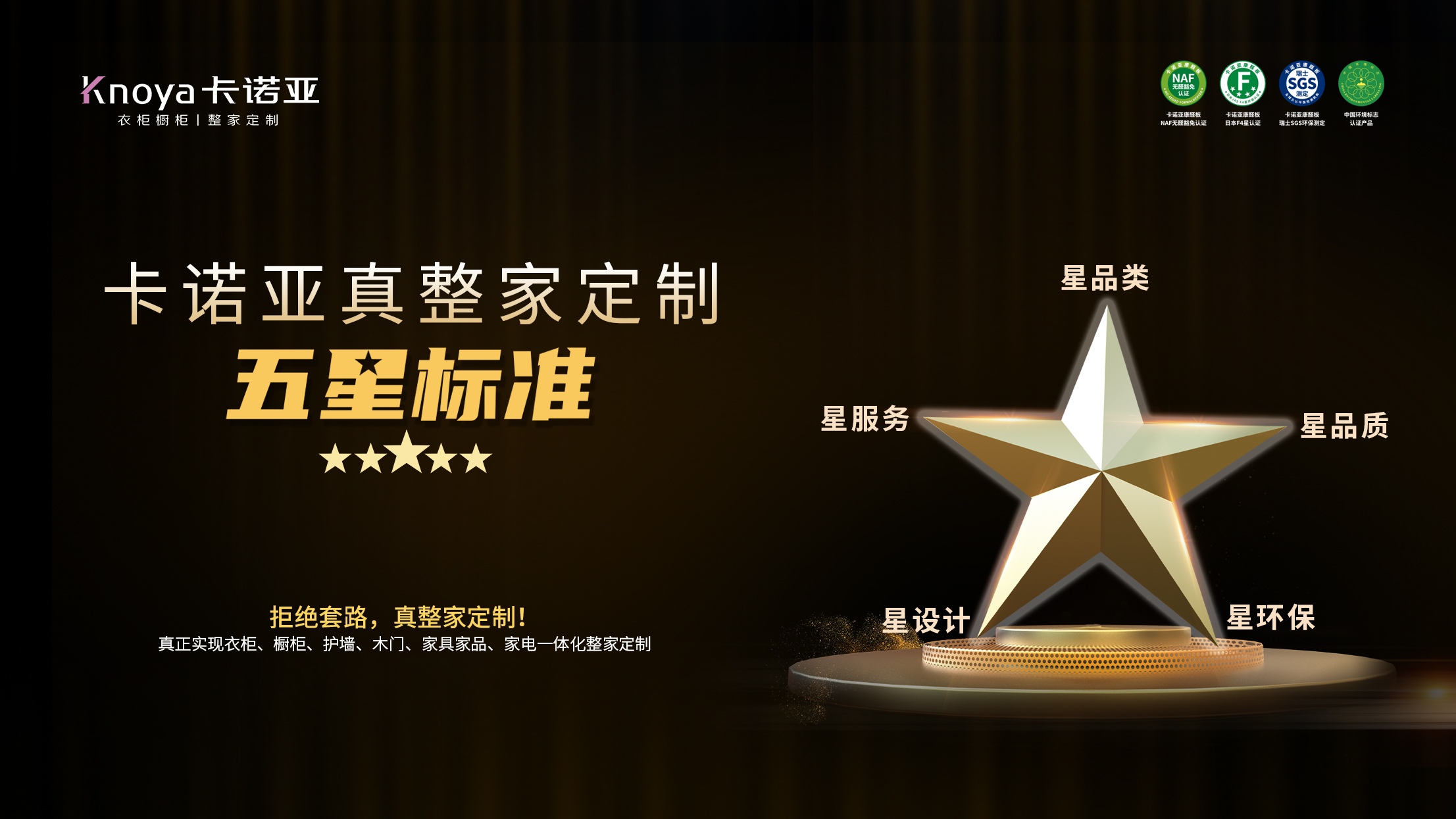 卡诺亚实施线上线下全网营销,其年轻、时尚、国际化品牌形象获得了进一步的曝光。同时,在全新品牌战略定位指引下,卡诺亚用心打造精于定制(21年定制行业经验)、高于颜值(大师级设计研发)、成于品质(产品高品质、生活高品质)的品牌核心价值链,依靠行业首创“真整家”的星品类、星品质、星环保、星设计、星服务5星标准,借助5大基材、5大风格、6大品类、9大空间的4大支撑,以核心产品衣柜、橱柜为入口,柜、墙、门一体,配套多空间家具家品与家电,形成整家一体化方案,为消费者提供真整家定制服务模式,真正实现“高颜质的家,就要卡诺亚”的品牌承诺。