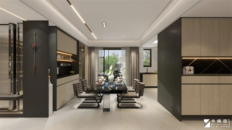 靠近餐桌的地方设置了餐酒柜,色彩与全屋呼应,茶色玻璃柜门通透可见,可以收藏香槟与红酒、杯具,觥筹交错,微醺生活,是E人聚会轰趴的好地方。