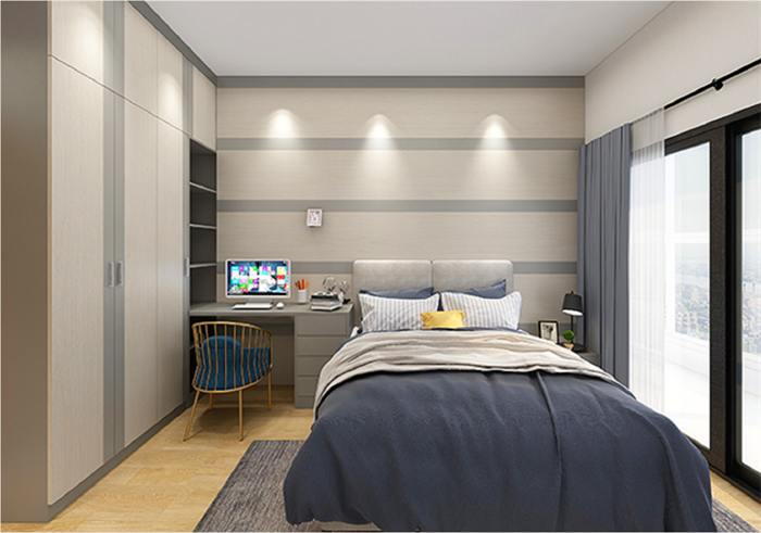 卧室有一个超大肚量的衣柜,高度直接到顶,宽度占据一整面墙,衣柜+书桌书柜一体设计,收纳衣物、写字看书学习都有了。