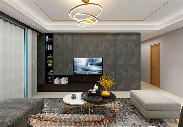 客厅的电视背景墙是用深灰色护墙板做的,它既是装饰背景墙,同时也是储物柜,客厅要用到的小物件可以直接放在里面,超实用的,而且装饰效果也yyds!