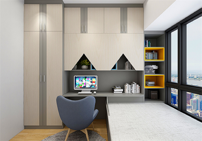 因为空间有限,所以儿童床直接做成了榻榻米,衣柜和写字桌椅同样是一体设计,这样能更好的利用空间。