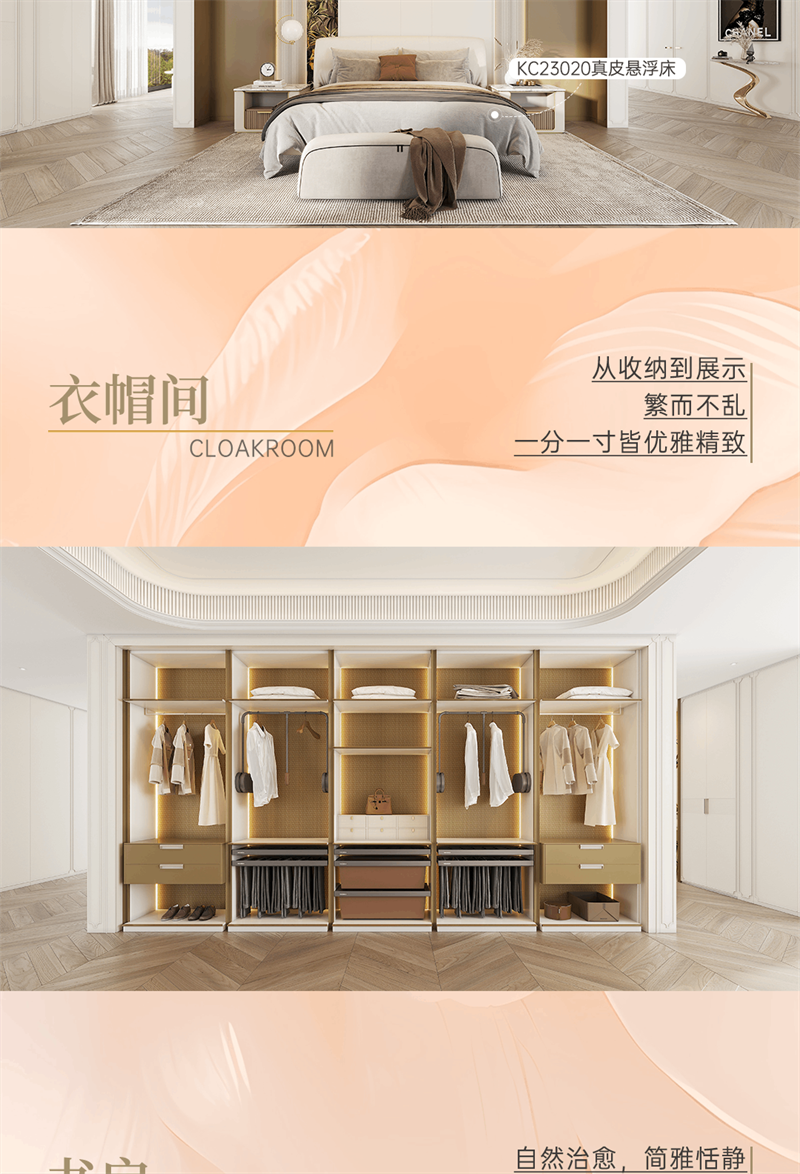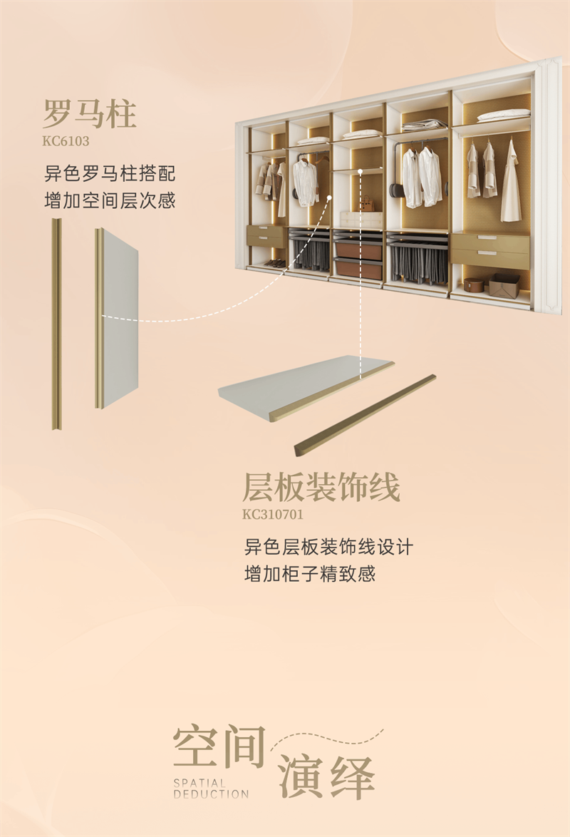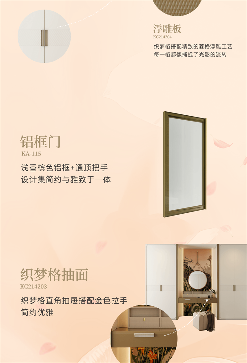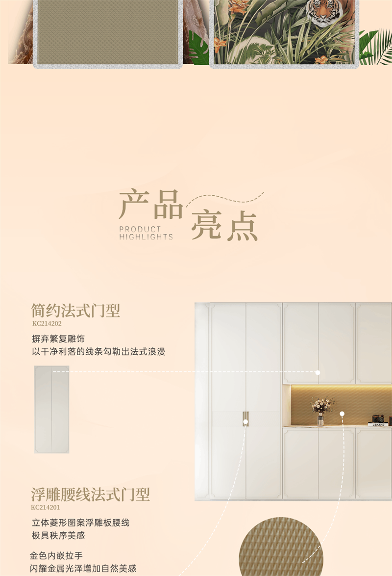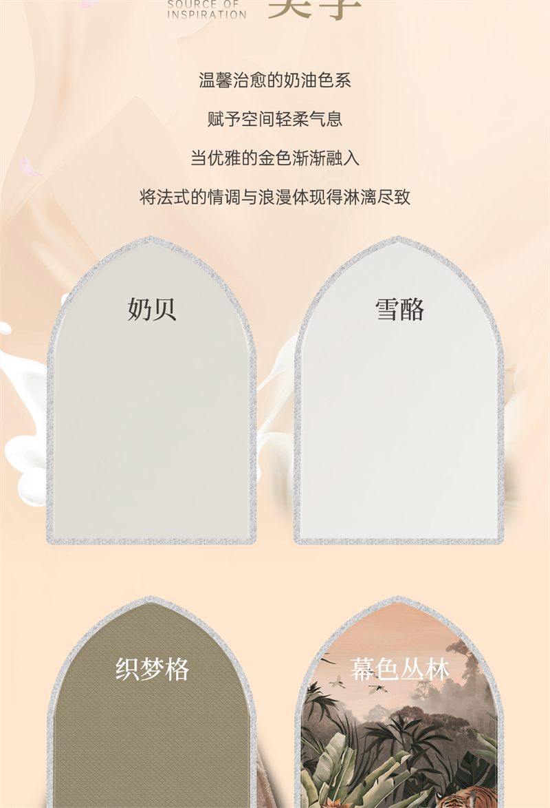 系列产品整体以奶油白和金色元素为空间基调,将法式的气质融入现代空间,以精致细节的融入,让家成为容纳更多想象的美好生活殿堂,让“美”成为一种生活态度。