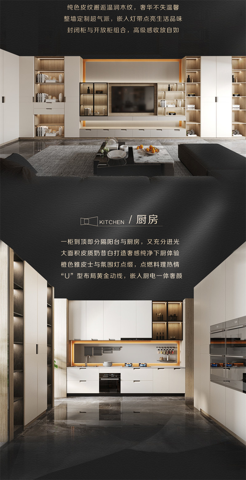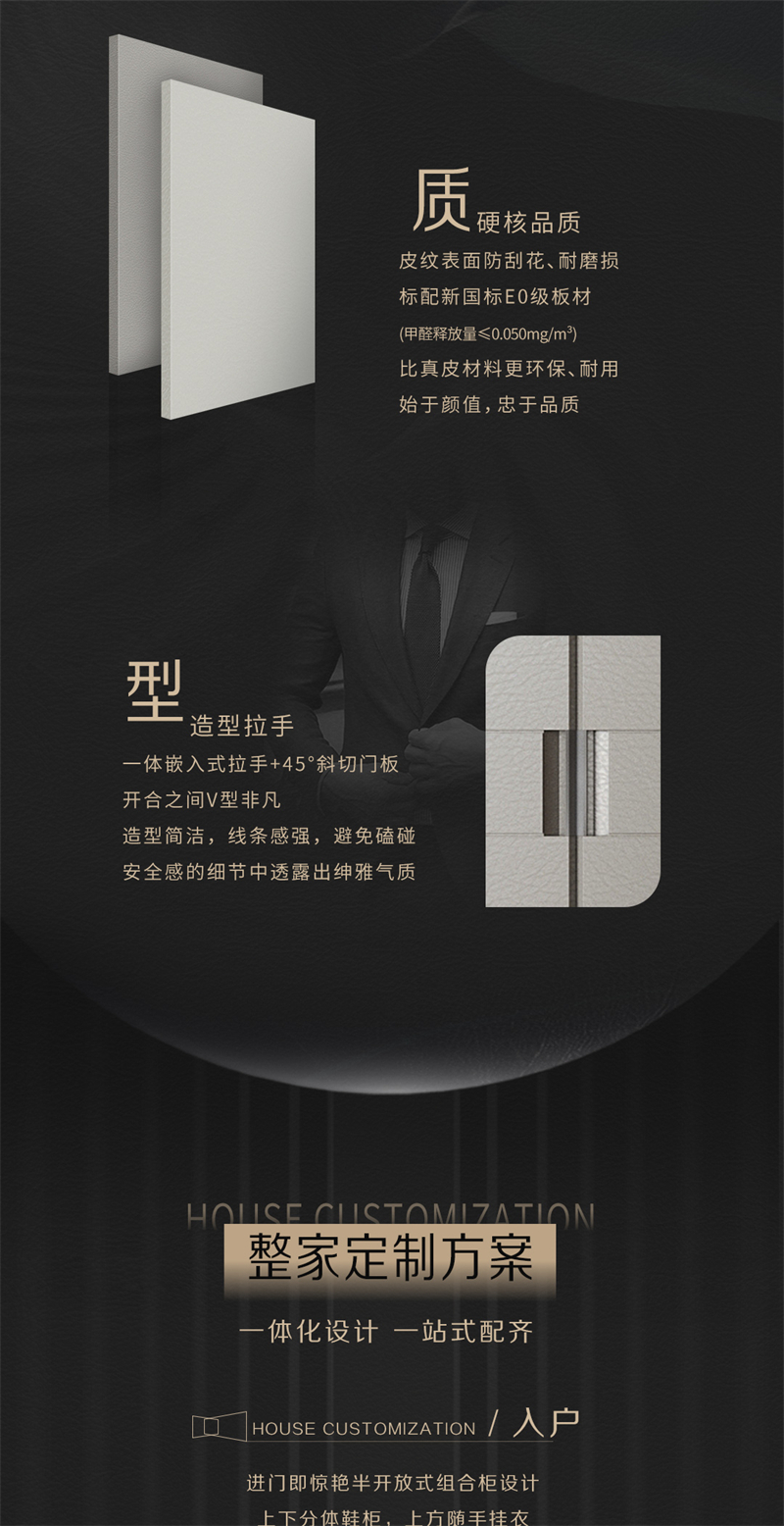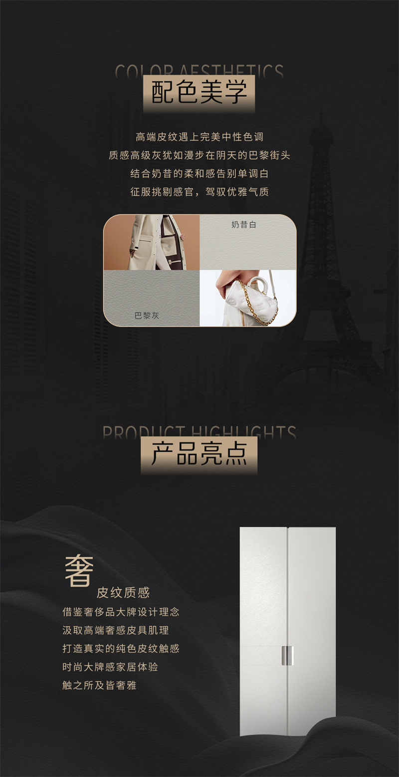 灵感来源于皮具奢侈品Hermes和LV 提取“H’元素勾勒门板简洁腰线 结合'V'元素塑造门缝立体造型 采用高端皮质肌理打造极简造型门板 简奢有度优雅有品的生活拉开帷幕