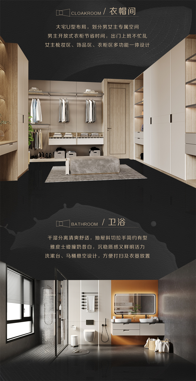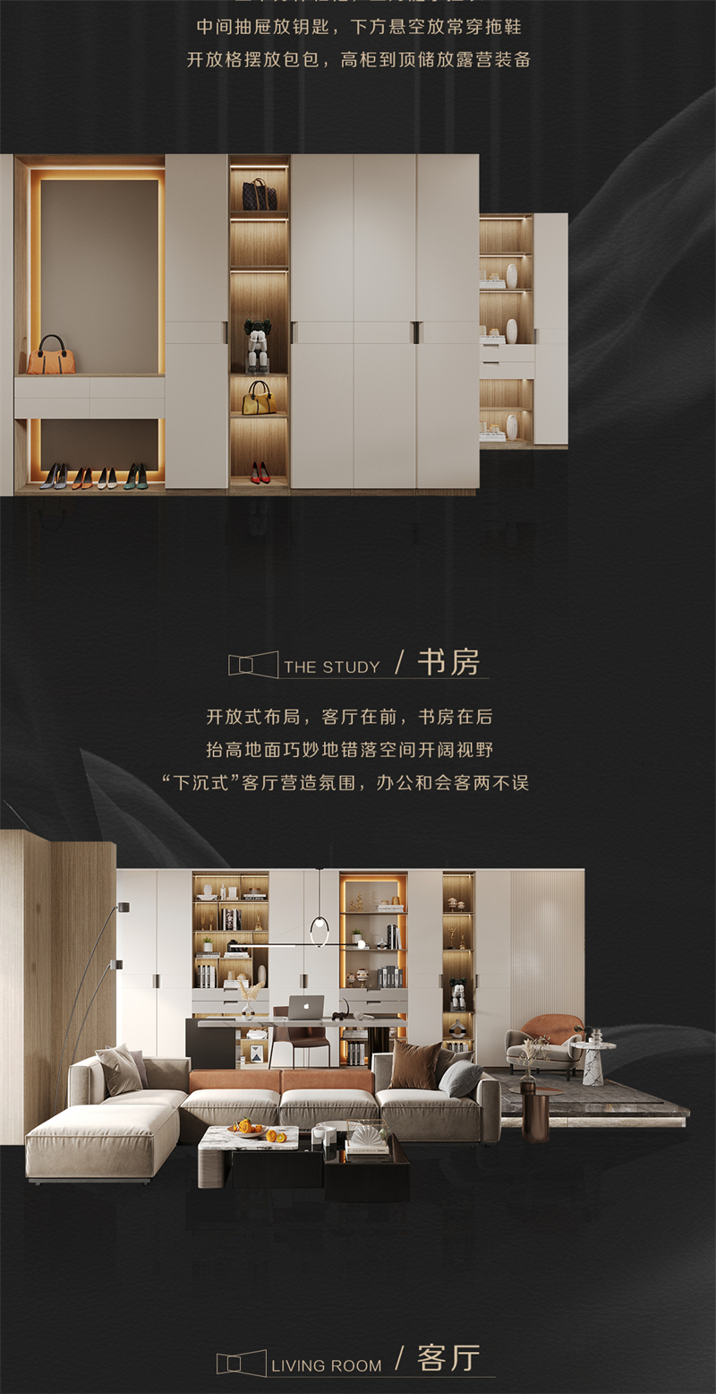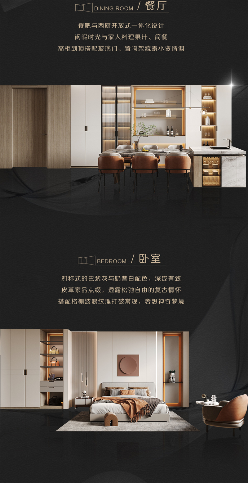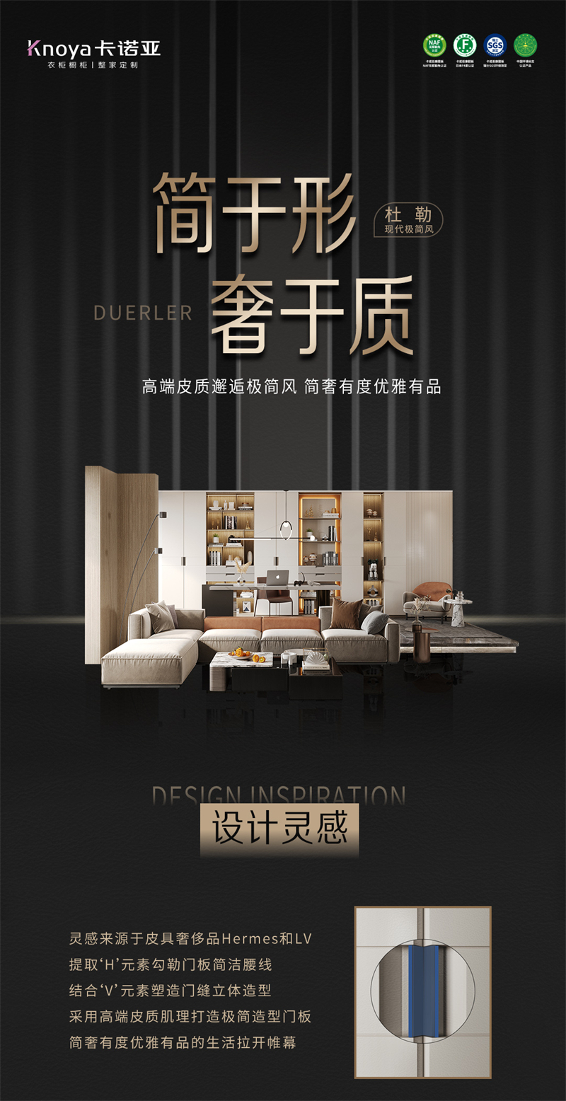 灵感来源于皮具奢侈品Hermes和LV 提取“H’元素勾勒门板简洁腰线 结合'V'元素塑造门缝立体造型 采用高端皮质肌理打造极简造型门板 简奢有度优雅有品的生活拉开帷幕