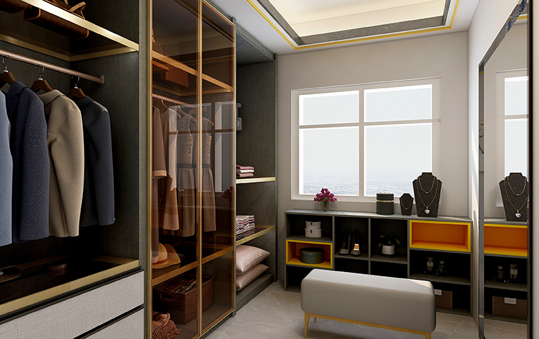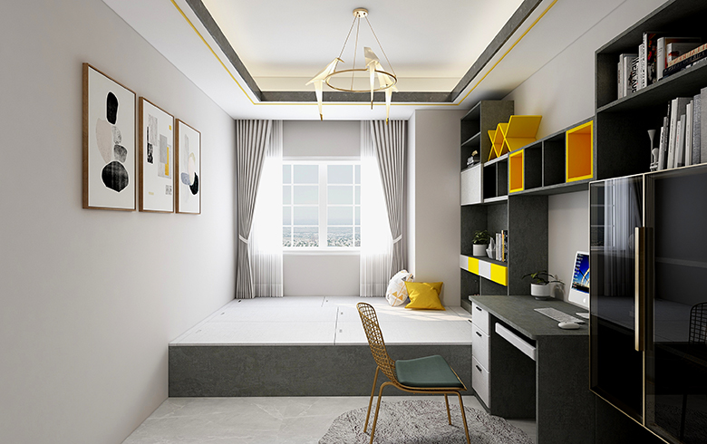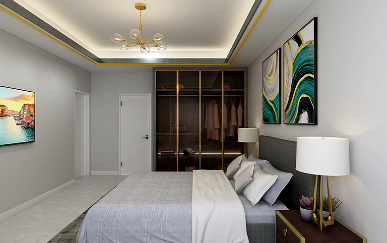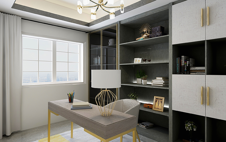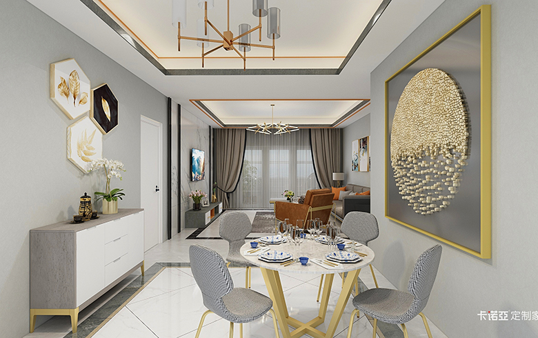 房屋空间四室两厅两卫,套内面积111平米,四室分别是主卧,次卧(榻榻米),书房,衣帽间,满足了三口之家的日常使用需求,使空间利用率达到最大化。全屋柜体采用深色板材,运用玻璃门和浅色门板配金色拉手,通过棚线和家具颜色的搭配来达到风格统一,打造轻奢风格。客餐厅通过金色家具和软装,浅色的壁纸,体现温馨的氛围。