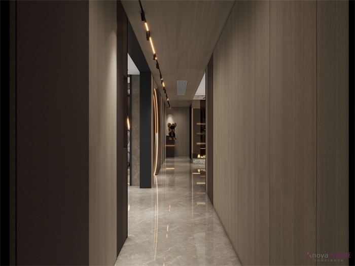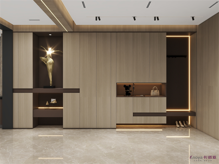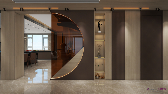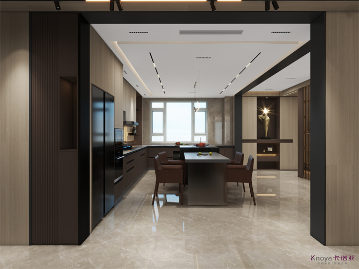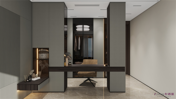意式极简既具有意大利文艺复兴时期的意蕴,奢华高贵,同时又兼具现代感的干练高级,深棕色的木饰面搭配原木色穿插营造的高级感贯穿整个空间,利用材质的对比与反差加强空间的质感感受。优雅与深邃的配色让空间散发出静谧感,简约的线条在诉说永恒的经典,脱离一切的浮华与烦躁。身居清雅地,心无车马喧,从生活的本质出发,让它静下来,感受快节奏都市生活背后的安静与宁静。设计理念:用简洁的线条勾勒出美妙的形体,在简约的氛围当中体现高级感,删繁就简,简而不凡。整家视界 全案生活|第六届卡诺亚整家设计精英联赛