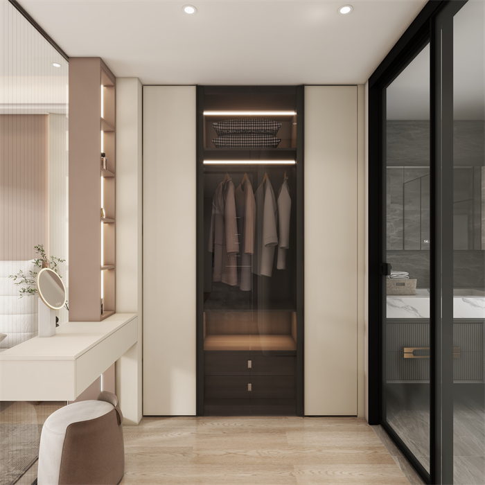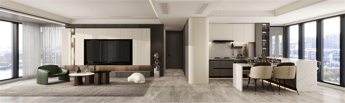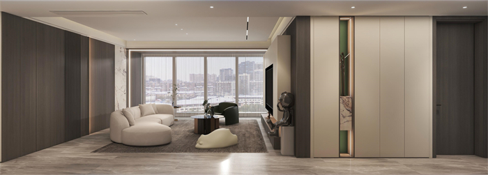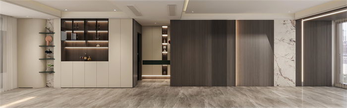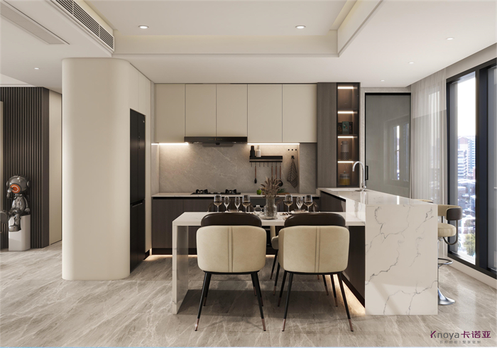 这是一个三口之家,客户是都市精英人才,对生活充满了热爱,对品质有着极高的要求,所以本方案主要以高级灰木纹色为主,搭配温柔典雅的水性漆雅杏,给客户营造一个亲近自然,同时又不失奢华的温馨舒适的空间。厨房在原有的空间上做了一个大胆的改造,打造了一个中西结合的开放式厨房,空间更大,功能更齐全。同时一些墙角和柜体也做了圆弧设计,动线更加流畅的同时,更显时尚和高级。