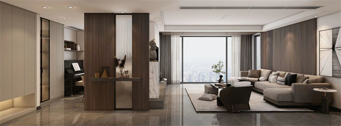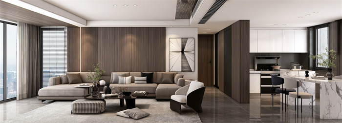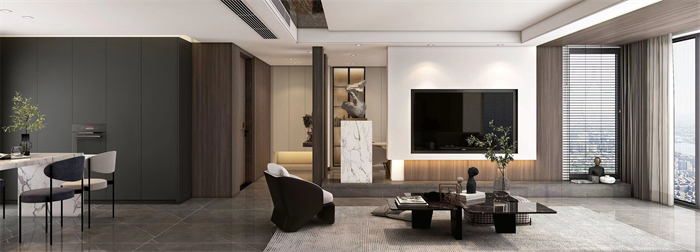作品简介:本作原布局是标准小四房,入户小房间改为交互式客餐厅一体,使得整个空间更加开放通透。出发点为表现出整个空间的连贯性和交互性。全案使用了色块面积较大的“棕丝木”。木纹细腻舒畅,结合卡诺亚专属专利扣线,无胶安装,海棠角完美细节呈现。整体深色木纹系作为主线,纯色块漆面材质作为点缀,小比例艺术玻璃等;各材质协调使用。设计理念:以此为生,忠于此道;追逐本真,保持热爱。从需求出发,做有温度有灵魂的人居空间。整家视界 全案生活|第六届卡诺亚整家设计精英联赛