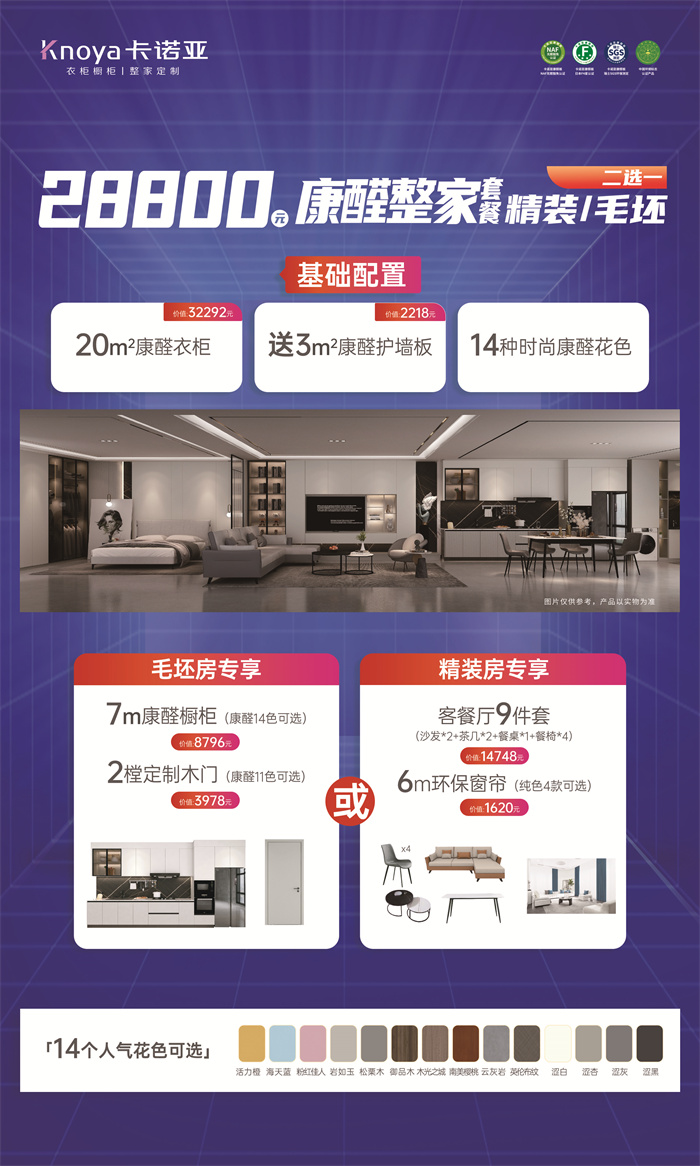 针对毛坯房,卡诺亚精准推出28800元康醛整家套餐,包括20㎡康醛定制柜+7m康醛橱柜+2樘定制木门,送3㎡康醛背景墙;针对精装房,卡诺亚推出28800元康醛整家套餐,包括20㎡康醛定制柜+客餐厅9件套+6m环保窗帘,送3㎡康醛背景墙。购此套餐,或下定满30000元独享+999元惠送卜居真皮床。