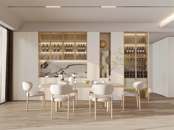 2、餐厅:纯粹简雅的奶油白配色,轻松营造愉悦的就餐氛围。餐酒柜三段式设计,上半段带玻璃门、灯带,适用于展示美酒、饰品,加上凹槽处艺术3D挂画,品味格调凸显,高级感拉满;中间镂空处台面,可用做收纳、水吧台、小电器等;下半段抽屉较多,收纳更强。