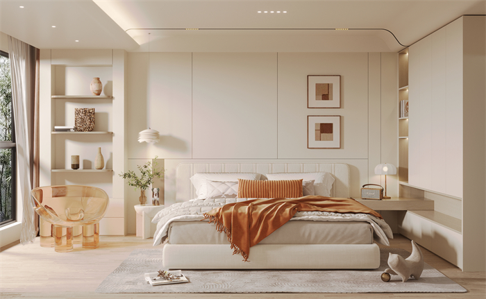 5、卧室:以奶油风白色调为主,床品、挂画、座椅等跳跃色点缀,淡雅温柔,仿佛为卧室加了一层柔光滤镜。衣柜底部延伸出悬空床头柜,一体设计更整体更省空间,一改传统床头柜的对称设计。大落地窗设计,光线好的床头一侧定制办公区和书柜,舒适兼多功能。