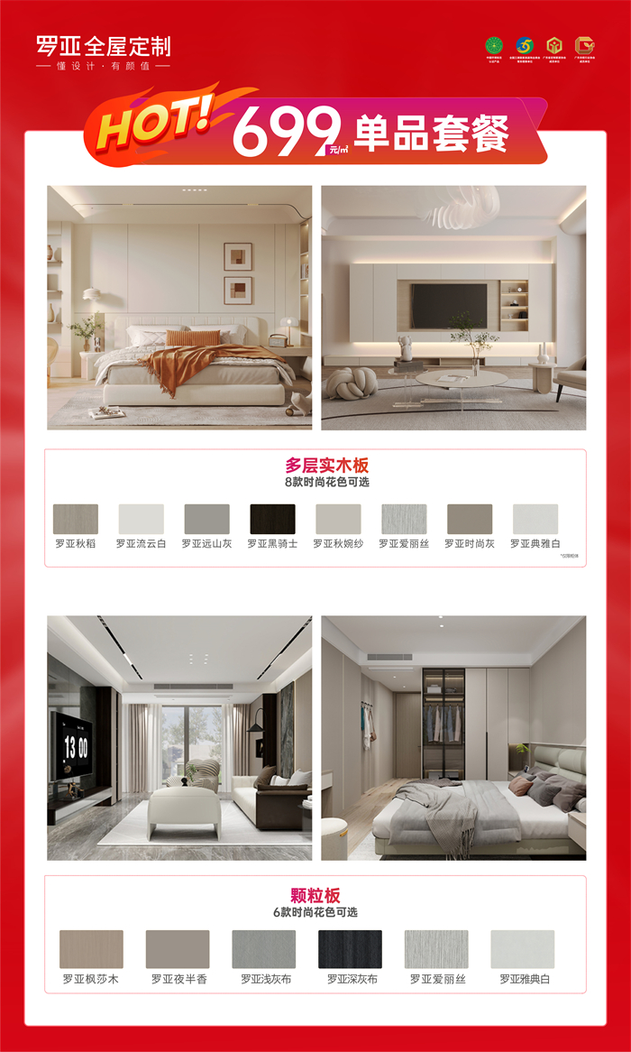 相比于市场上同类套餐,购买罗亚全屋定制柜/护墙板/定制木门,实现流行的柜墙门一体化设计,仅需29800元一价配齐,极具“质价比+心价比”优势;同时,柜墙门一体化搭配,无需操劳奔波建材市场每家比较,也不用担心花色、风格、售后服务冲突等一系列烦事,省时又省心。此外,该套餐分别针对毛坯房和精装房,配置了不同的套餐内容。