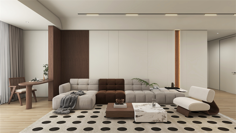 沙发背景墙采用深浅撞色设计,与电视柜、沙发在色彩上相呼应。隔断墙延伸的书桌,既可作为隔断,又能办公学习。