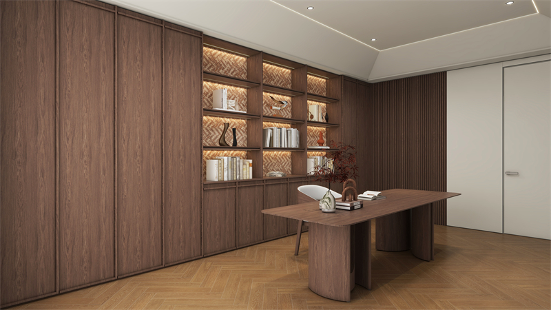 整墙书柜巧妙地运用了骨骼门,凹凸有致的骨骼线,将线条元素与柜体柜门完美融合,增强视觉冲击力。结合胡桃木的色彩纹理,营造复古的空间氛围,勾勒中古风独有的精致造型,彰显别样的艺术气息。