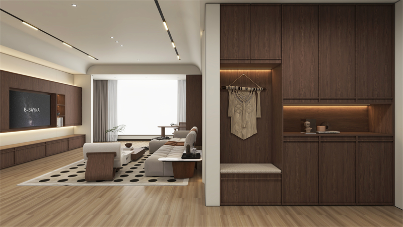 清秋胡桃与骨骼线搭配设计,从入户起就开始铺垫复古的基调。中间镂空、换鞋凳的设计,让鞋柜实用性与装饰性兼备,开放区集挂、坐、置三重功能于一体。