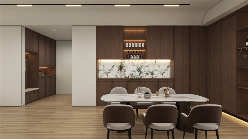 韶光系列汲取金秋的诗意灵感,煦色韶光,鎏金年华,于都市喧器中,借自然手法,将复古细腻的“清秋胡桃”棕色木皮纹理融于空间,营造高雅格调的诗意栖居空间。温暖而深沉的棕色,细腻的纹理,自然的质感,不禁让人联想到秋天的宁静,打造温暖怀旧且质朴高雅的氛围。
