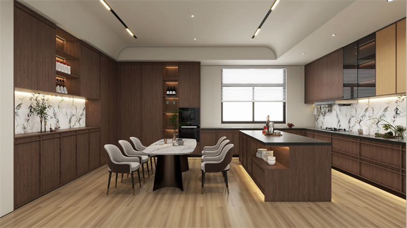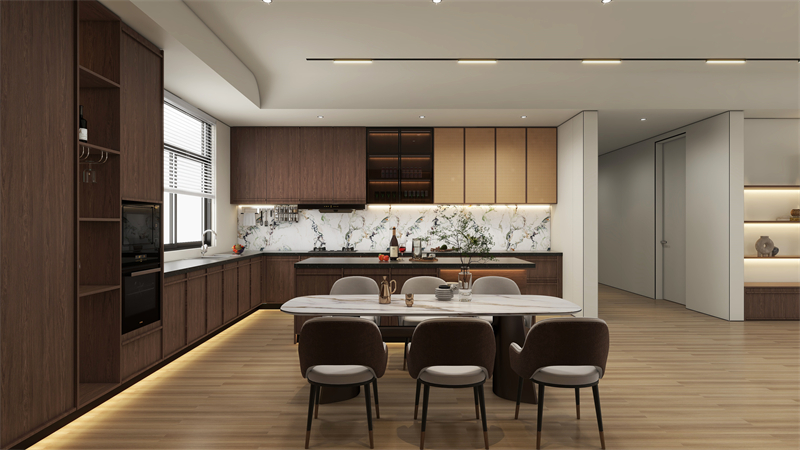 餐边柜和橱柜一体化设计,石纹背板嵌入,更显高级感,同色同奢定制,弱化了餐厅与厨房过渡的生硬感。