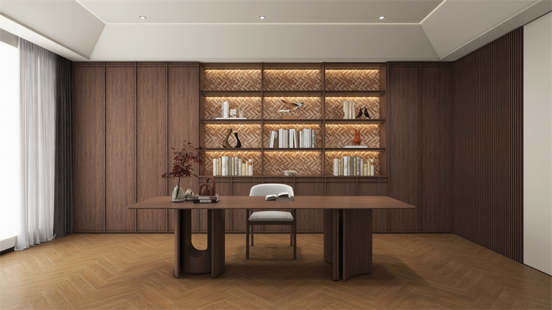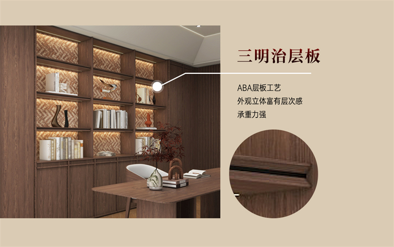 书柜采用三明治层板,外观立体,富有视觉层次感且承重力强。木纹拥有岁月和自然的痕迹,为空间增添怀旧感,让书房散发独特的气质。