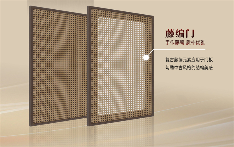 吊柜采用手作藤编柜门,质朴优雅,勾勒中古风格的结构美感,搭配骨骼门岛台,让空间更有质感和格调。清秋胡桃与藤编元素彼此呼应,将中古风的怀旧与精致展现得恰到好处。