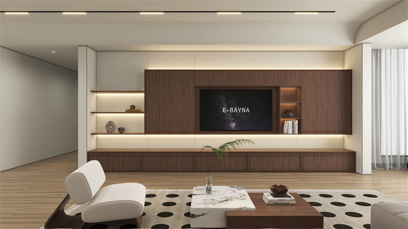 满墙电视柜+悬空设计,将收纳做到隐形的同时,也展现出了中古风的轻盈温馨,复古色胡桃木的加入,让中古气息越发浓郁。