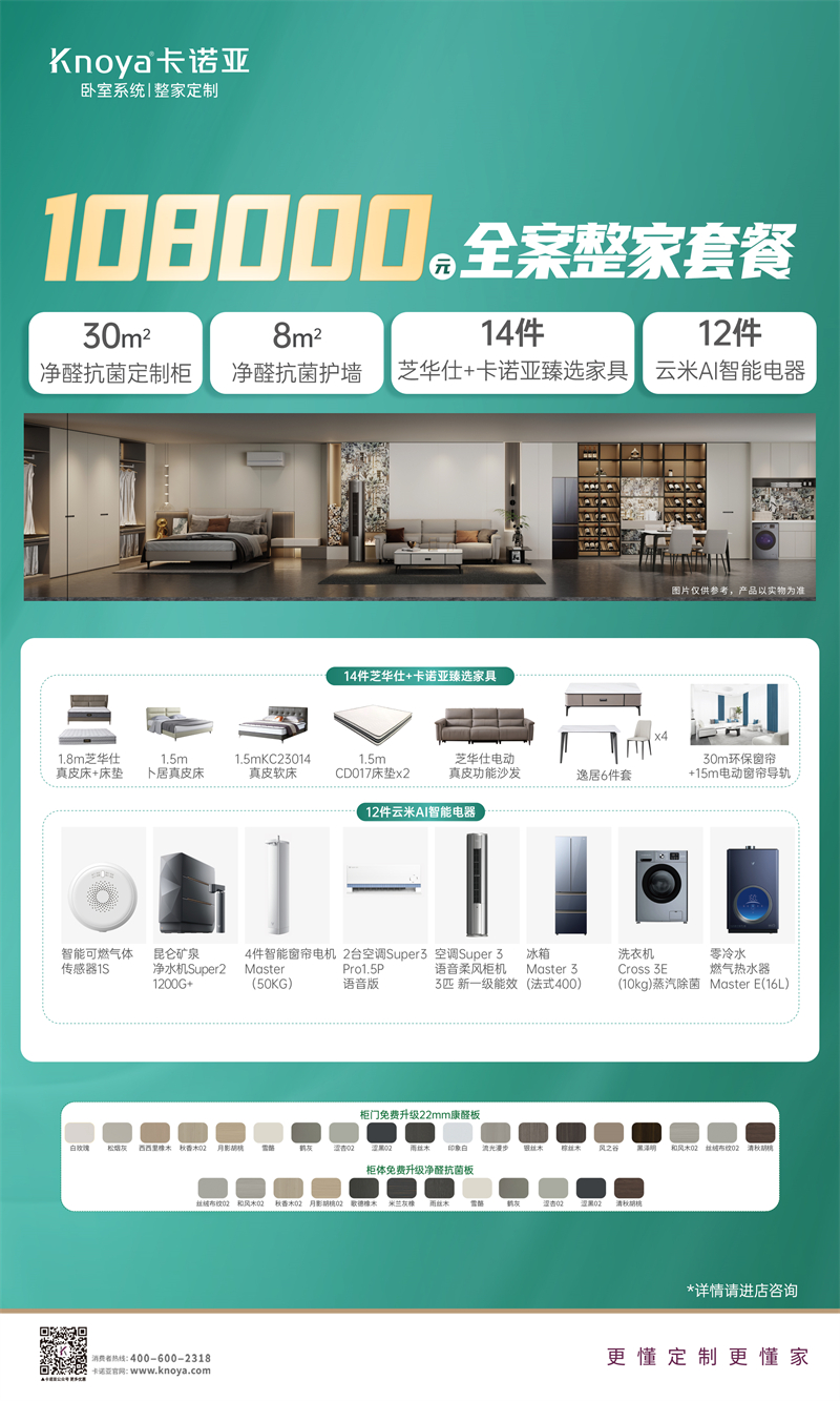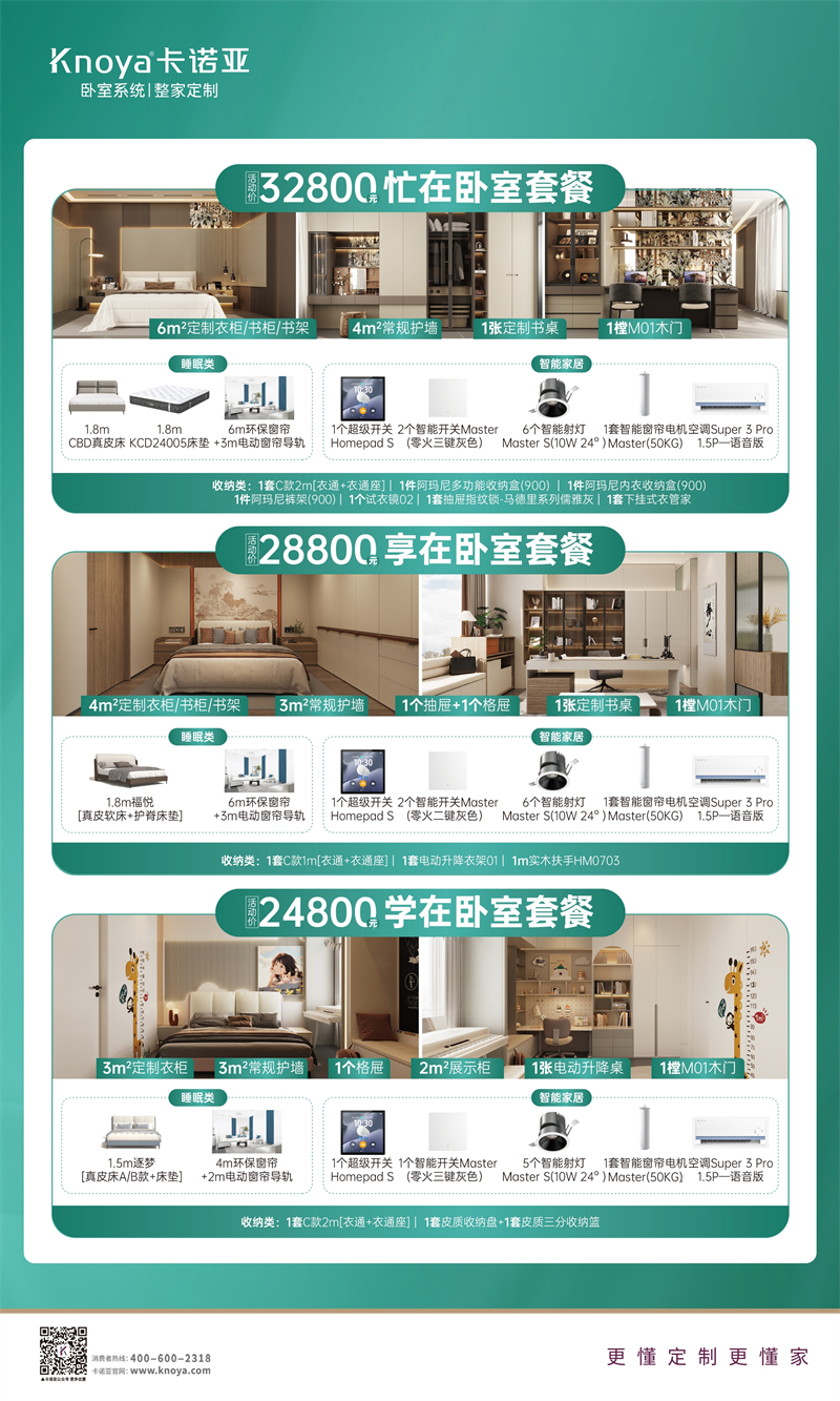 卡诺亚此次315活动,携手多个高端品牌如芝华仕、CBD、云米科技等,为消费者提供一站式的家居解决方案。活动期间,卡诺亚除了以上2大套餐,还精心推出32800元忙在卧室套餐、28800元享在卧室套餐、24800元学在卧室套餐等,涵盖卧室系统+整家定制两大品类,包括定制柜、护墙板、全屋家具以及智能家电,联手更多大牌,真正实现“整家定制更高配,全屋家具更满配,智能家电更全配”的理念。