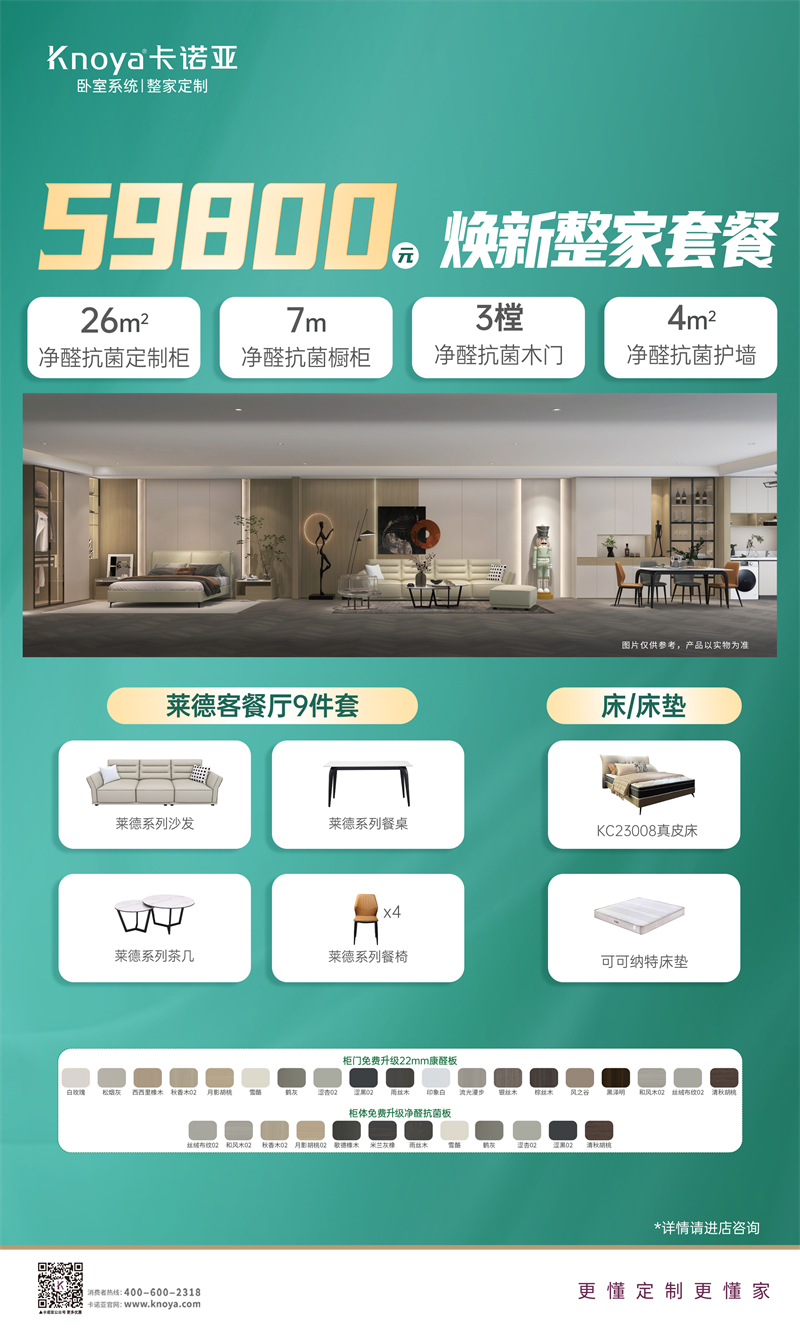 卡诺亚59800元全屋升级净醛抗菌家套餐,采用净醛抗菌板,拥有基材无醛添加、达ENF级国家最严环保标准、除醛、抗菌、防霉等优势,为毛坯房装修、旧房改造以及精装房的局部优化提供了一站式的解决方案。