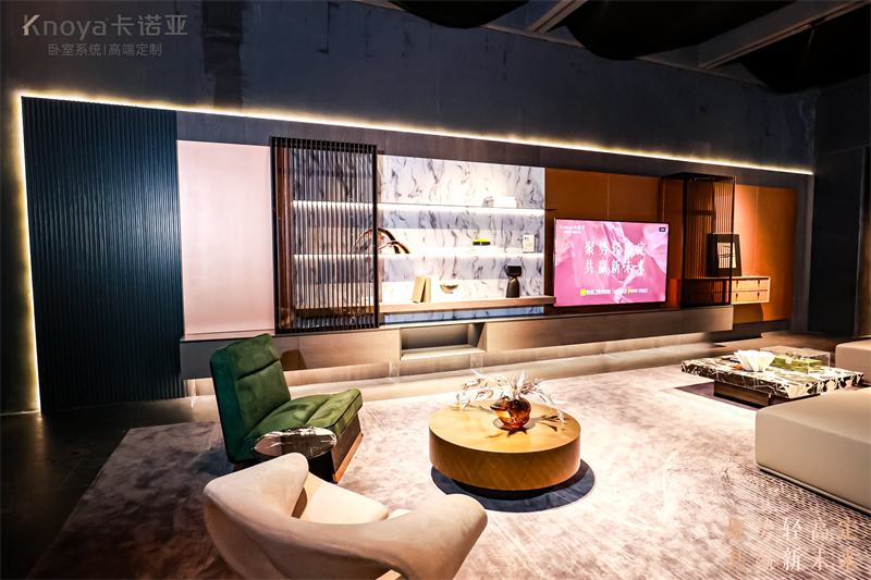其次,设计上,依靠原创设计构筑美学家居。卡诺亚推出的轻高定系列新品,均属于原创设计,以本次参加轻高定展的现代中式藏玉系列为例,采用天然胡桃木皮与数码打印石纹碰撞,原创品牌 LOGO 拉手与倒 R 角工艺相映成趣等,为企业高管精英构建礼序雅境;另一参展作品雅致轻奢风格格雅系列,从高级珠宝中淬炼灵感,运用珍珠贝母漆的流光、拉丝黄铜的肌理等元素,结合豪华游艇的舷窗式结构打破传统空间的方正,发光层板与榆木木皮形成冷暖对话等,将艺术基因注入实用主义,打造功能多元化的美学家居空间。